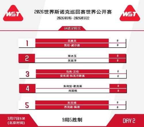 体育播报3月16日宣 斯诺克世界公开赛第二比赛日(3月17日)赛程安排如下。
