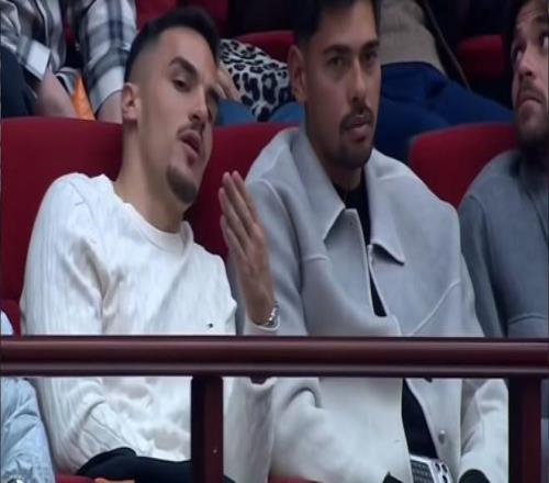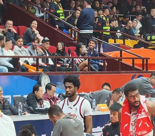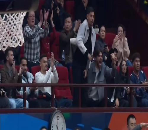 山东高速男篮主场看台上,迎来7名山东泰山队球员现场观战,他们分别是克雷桑、卡扎伊什维利、泽卡、马德鲁加、阿尔瓦罗、李小恒和德尔加多。