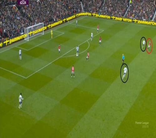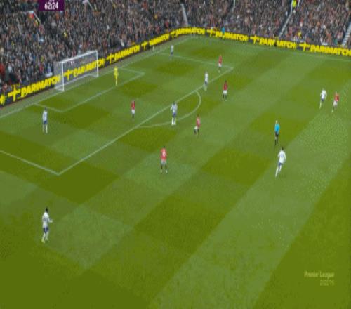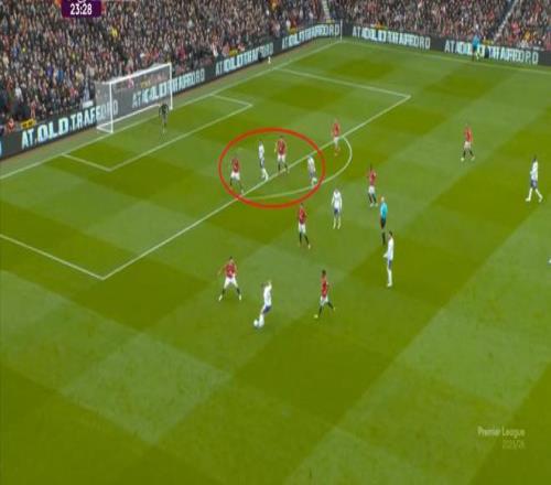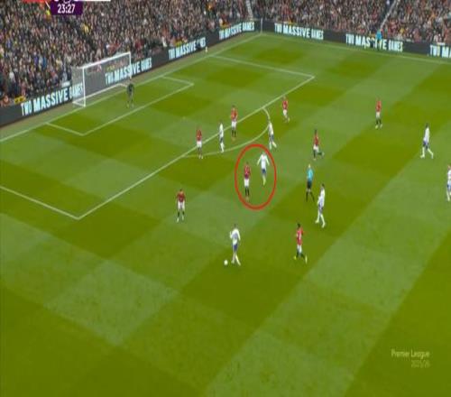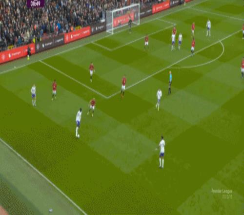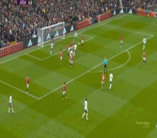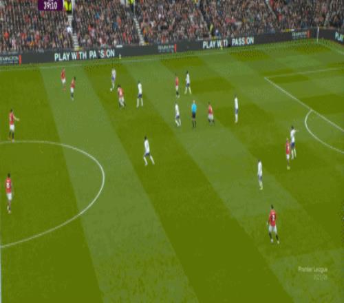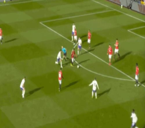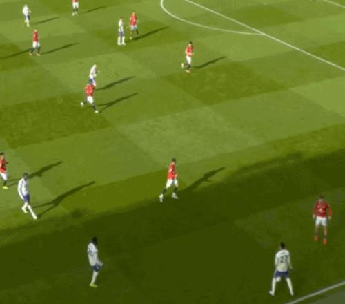 麦金的斜插,从盯人角度来说,应该是卢克-肖负责,但到了这个位置,卢克-肖首先要镇守自己的区域,毕竟不能被打击到宽度,而从区域的角度来说,应该是梅努负责,但他并没有去提前预判和启动身体: