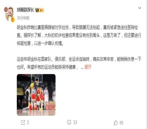 至于在广厦战胜宁波的比赛,胡金秋不慎被对手拉伤肩膀,导致他无法抬起胳膊,赛后也是被球队紧急送往医院检查。根据球圈赵探长的报道:“大秋(胡金秋)的初步检查结果是没有伤到骨头,这是万幸了,但还要进行核磁检查,以进一步确认伤情。”