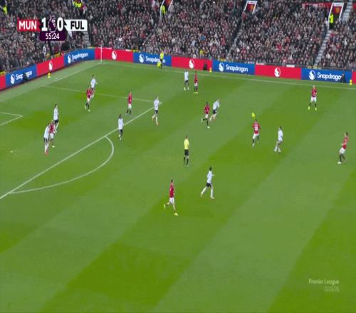 此处,库尼亚向内切,费尔南德斯向边线移动,曼联从右路进攻。随后阿马德重新组织攻势,暂时扮演起“10号位”(中路组织者)的角色,将姆伯莫换位到左侧。