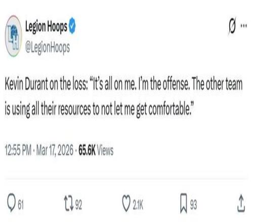 赛后杜兰特谈及本场失利时说道:“我为此负全责,我是进攻核心,对手倾其所有防守资源,就是为了不让我打舒服。”
