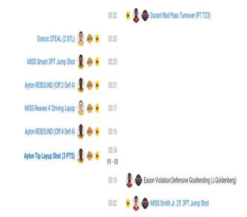 终场前4分52秒杜兰特8秒不过半场低级失误,也是这个失误让艾顿篮下补篮帮助湖人反超,终场前3分32秒杜兰特又是一个想要穿过两人包夹的传球失误,不得不说KD这一波令人很无奈,短短118秒里2铁+2失误。