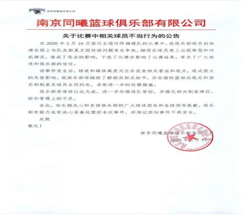 2名球员比赛过程中起争执南京同曦篮球俱乐部致歉