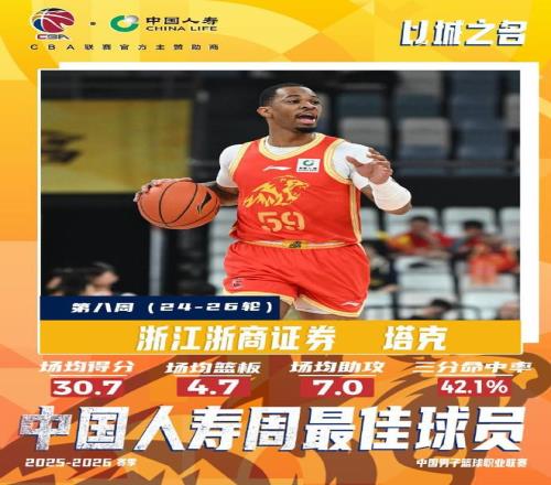 CBA官方社交媒体写道:浙江浙商证券球员塔克本周出战3场,率队取得其中2场胜利,他场均出场32分钟,可以得到30.7分、4.7篮板、7助攻,本周塔克以42.1%的三分命中率场均命中2.7记三分球。