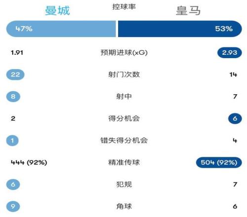 双方门将均表现神勇,曼城全场22次射门,预期进球数1.91,皇马14次射门,预期进球数2.93,两队一共创造了8次绝佳机会。