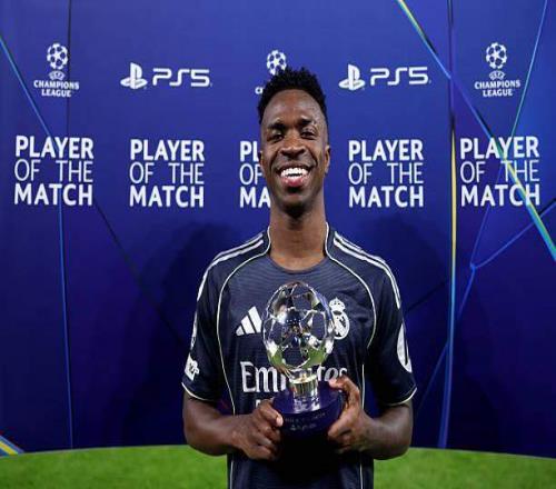 第22分钟,维尼修斯操刀点球骗过唐纳鲁马得分,皇马1比0领先,总比分4比0。进球后,维尼修斯做出“爱哭鬼”的动作,回击曼城球迷准备的罗德里巨型海报,并跑到角旗处示威庆祝。