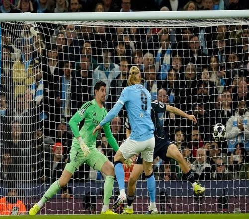 第23分钟,罗德里大范围转移,多库左路反越位前插下底横敲,哈兰德抢点捅射被库尔图瓦神勇扑出,随后皇马立马快速反击,迪亚斯摆脱分球,维尼修斯又是一次一对一长途奔袭甩开防守后劲射稍稍高出了横梁。第26分钟,多库左侧肋部直塞,哈兰德斜插跑位小角度低射,又是库尔图瓦神扑救主;1分钟后,楚阿梅尼中圈斜线转移,居莱尔组织反击横敲禁区,维尼修斯点球点抢点铲射险些再进一球。