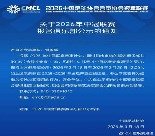 体育播报03月18日宣 中国足协官方公示2026年中冠联赛报名俱乐部,80家报名俱乐部(含1家候补参赛)通过初步审核,恒大足校在列。