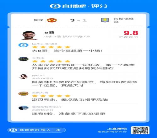 这是B费本赛季第5次当选【体育播报X咪咕体育英超每轮MVP】评选最佳。吧友热评:游刃有余,差点助攻帽子戏法!大B哥当今英超第一中场!