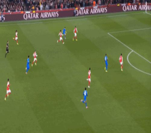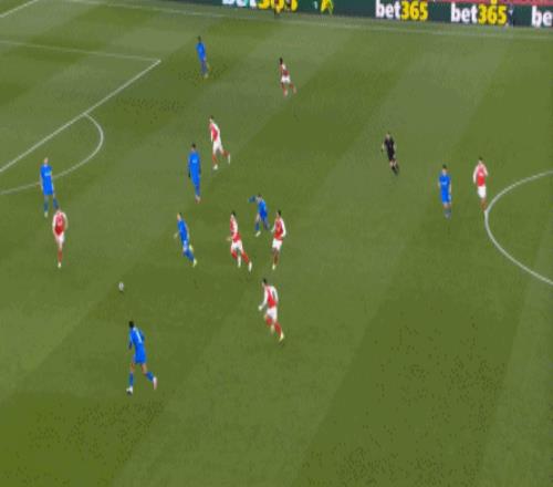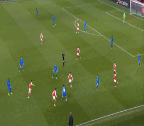 但是,随着队形的向前,三线的距离就会变得难以保持,这是面对比分落后的球队最难以处理的问题,也是比分领先的球队需要把握的机会,所以到了下半场,阿森纳依然可以通过长传球打进两线之间,从而衔接射门: