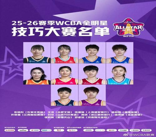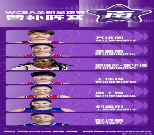 万济圆入选全明星正赛南区替补阵容;李雨汧、代梦帆入选星锐赛南区阵容;董可尔入选三分球大赛;周琪入选技巧大赛。