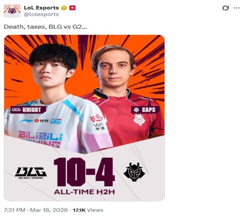 体育播报3月18日宣 今日BLG将迎战G2,赛前官方推特发布两队的历史战绩10-4,随后G2在评论区中回复:马上10-7!