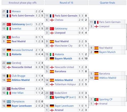 最终,巴黎圣日耳曼、利物浦、皇家马德里、拜仁慕尼黑、巴塞罗那、马德里竞技、里斯本竞技、阿森纳晋级1/4决赛。八强由西甲3队、英超2队、德甲法甲葡超各1队组成。
