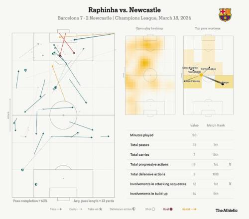 在这场混乱的比赛中,拉菲尼亚频繁参与其中,屡次给纽卡制造麻烦(如下方的球员数据图所示)。正是他的任意球传中——得益于纽卡的防守——帮助伯纳尔为巴萨取得2-1领先。