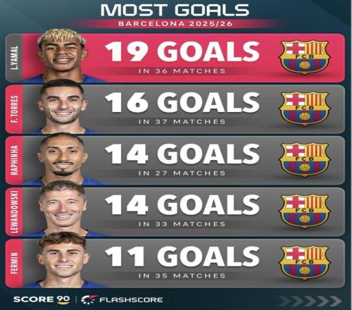 巴萨2025/26赛季队内进球最多