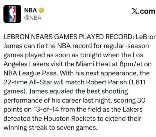 詹姆斯在自己第23个赛季,继续解锁新的历史纪录。如今詹姆斯成功达成生涯1611场常规赛成就,追平帕里什并列NBA历史第一,也是仅有的两位超过1600场的球员,而下一场詹姆斯就将超越帕里什独占历史第一。