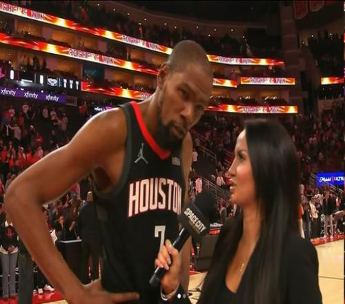 值得一提的是,关于杜兰特接受这位美女主持人的经典瞬间不仅仅是只有亚历山大调侃的这一幕。在此前休斯顿火箭以100-97击败菲尼克斯太阳的比赛中,凯文-杜兰特超高难度三分绝杀对手,赛后,美女主持人瓦妮莎-理查德森采访的一幕走红网络。