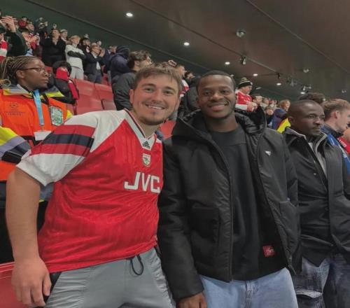 24岁的布伦特福德边锋丹戈-瓦塔拉出现在了阿森纳战胜勒沃库森的比赛现场。