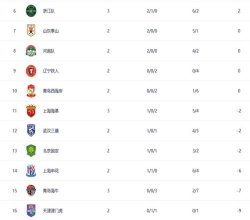 赛季前2轮,浙江队取得1胜1平的成绩,以-1分排名第10位,上海海港以1胜1负的成绩,以-2分排名第11位。同时,取得两连胜之后,山东泰山、河南队积分“清零”,成为前两支积分清零的球队。