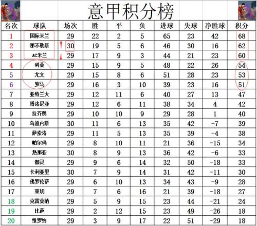积分榜方面,国米继续稳稳领跑,那不勒斯连续4轮一球小胜夺4连胜,先赛的他们暂时超过AC米兰2分升至第2。争四很激烈,黑马科莫1分优势力压尤文守住第4,罗马3分之差排在第6。