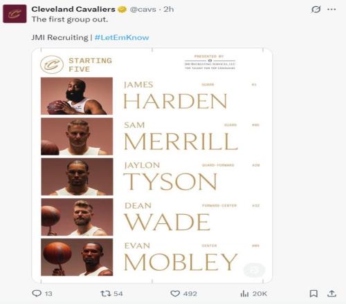 这场比赛多诺万-米切尔因为眼部的伤势缺席,哈登与莫布利带队,阿伦依旧在伤病名单上。