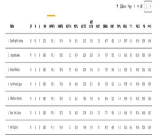 詹姆斯得分湖人第三,篮板湖人第二,助攻湖人第三,命中率湖人第二,三分命中率湖人第二,正负值湖人第四,很明显41岁勒布朗的贡献被大大低估了。