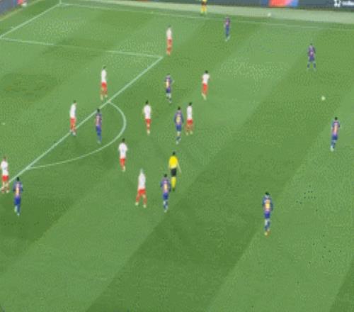 弗里克的战术体系下,莱万的价值是巨大的,通过这名中锋的大范围游动,可以带来不对称的前插打击空间。这一次就是中卫马丁和莱万连线,然后贝尔纳尔又前插了。