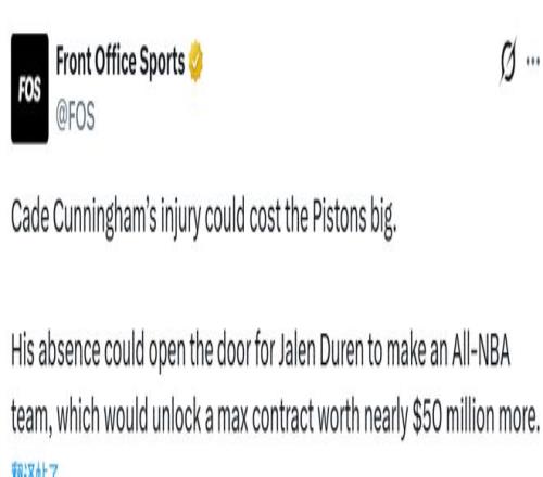 目前活塞稳居东部第一。此前休赛期,活塞本有机会提前续约杜伦。当时杜伦索要年薪超3000万美元,双方谈判破裂,杜伦今夏成为受限自由球员。谁也没想到,杜伦本赛季迎来爆发,入选全明星,还是最快进步球员的最大热门。分析师指出:只有活塞,能给杜伦开出30%工资帽的顶薪;其他球队最多只能开出25%的顶薪。
