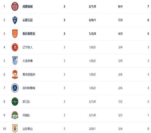 前3轮之后,成都蓉城以7分继续领跑积分榜,云南玉昆(6分)、重庆铜梁龙(5分)排名第2、3位,辽宁铁人、大连英博、青岛西海岸、深圳新鹏城同积3分。