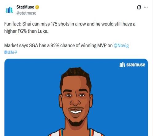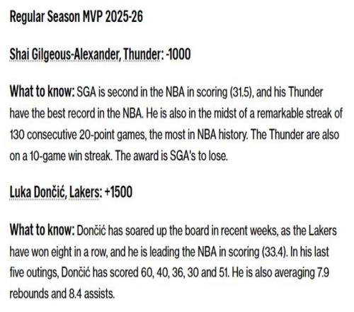 另外,体育预测市场平台Novig则表示SGA(亚历山大)有92%的机会赢得常规赛MVP。