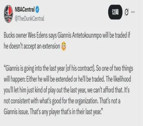 雄鹿老板韦斯-埃登斯接受ESPN采访时,明确表示下赛季为字母哥的准合同年(27-28赛季拥有球员选项),球队不可能承担如此风险。