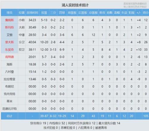 最后4.7秒,湖人落后2分握有球权。湖人一个完美的边线球战术,詹姆斯篮下被班凯罗盖掉。湖人底线发球,斯玛特妙传肯纳德,后者大空位三分准绝杀。只剩0.6秒,魔术没有暂停了。全场结束,湖人105-104魔术,豪取9连胜。