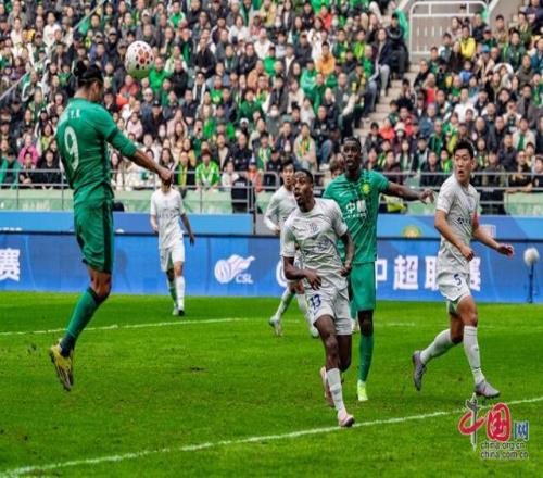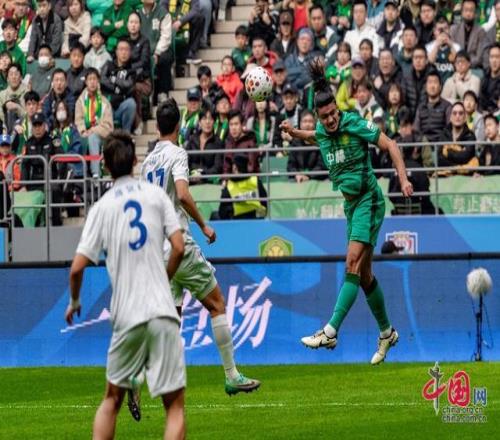 3月21日,在北京工人体育场进行的2026赛季中国足球协会超级联赛第三轮的比赛中,北京国安队主场1比1战平上海申花队。图为上海申花球员头球攻门。中国网记者 郑亮摄