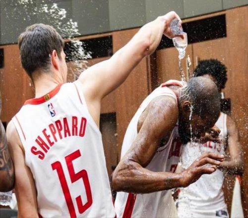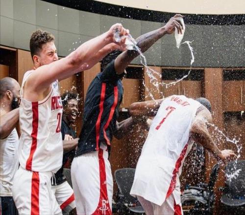 相比于打破纪录,更重要的是赛后全队在更衣室中朝杜兰特泼水庆祝,气氛非常棒打破了外界对于火箭队内部不和的一些猜测与流言。