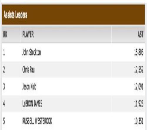 助攻:詹姆斯在历史助攻榜上排名第四(11925次),大概率追不上纪录保持者约翰·斯托克顿(15806次),但他有可能在下赛季初追上杰森·基德(12091次),并在下赛季末追上克里斯·保罗(12552次)。