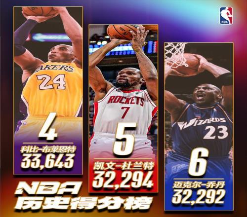 此役末节还剩3分36秒,杜兰特射落底角三分,本场得分来到27分,生涯总得分就此超越乔丹,升至NBA历史第五位。