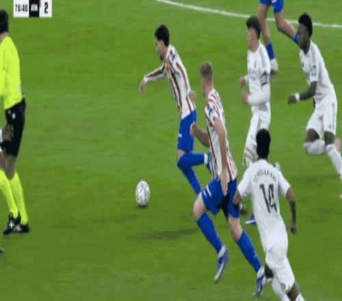 第55分钟,又是汉茨科,他的回传如同炸药一般,吉梅内斯的出球被巴尔韦德抢断,后者一脚捅射,皇马3分钟打进2球,反超比分。