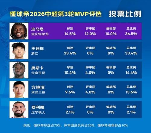 大家好,欢迎来到懂球帝2026赛季中超MVP的评选现场。本赛季的第3轮MVP评选中,在川渝德比中梅开二度的迪马塔以36.5%的得票率反超王钰栋(33.3%)成功当选本轮MVP。这是迪马塔第1次当选懂球帝中超MVP。
