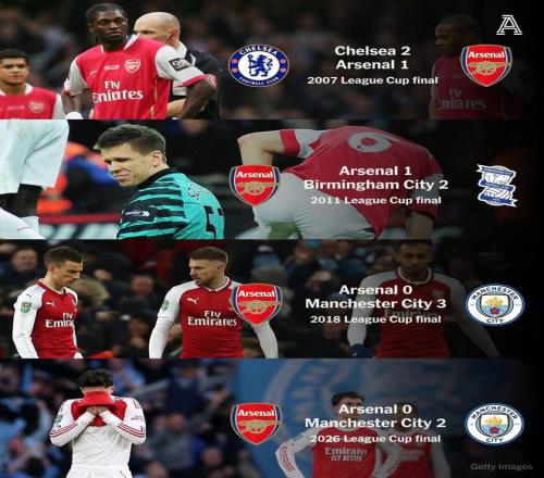 在刚刚结束的英联杯决赛中,阿森纳0-2完败曼城。至此,阿森纳遭遇了英联杯决赛4连败,再次无缘此项赛事冠军。