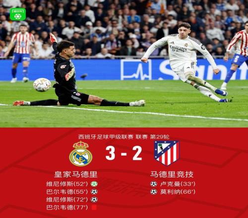 北京时间3月23日西班牙足球甲级联赛 联赛 第29轮,皇家马德里主场对阵马德里竞技。皇家马德里维尼修斯梅开二度,巴尔韦德破门。马德里竞技卢克曼破门,莫利纳破门。最终比分皇马 3-2 马竞。