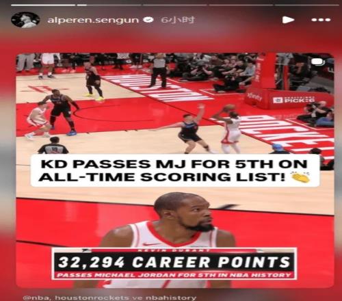 申京在杜兰特完成32294分超越乔丹后,申京在赛后专门在IG上转发这条推文来为KD庆祝。