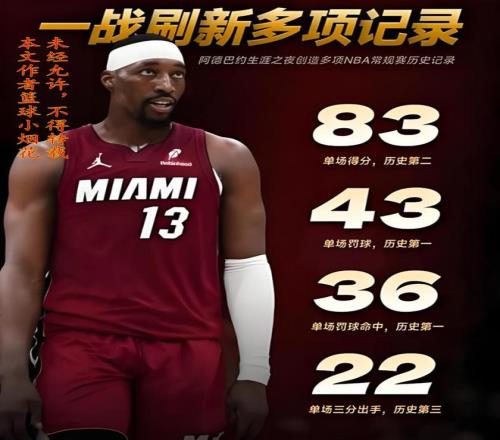 我问你,阿德巴约是历史级别的得分手吗?很明显他不是,他的进攻能力在NBA都排不上前二十,但他靠刷分,拿到了83分,那是不是意味着,任何一名进攻能力比热巴强的球员,在不考虑球队打法战术、队友心态以及比赛输赢的前提下,就可以疯狂出手,只为打破记录?这样的记录,即便是拿到了100分,你认可吗?