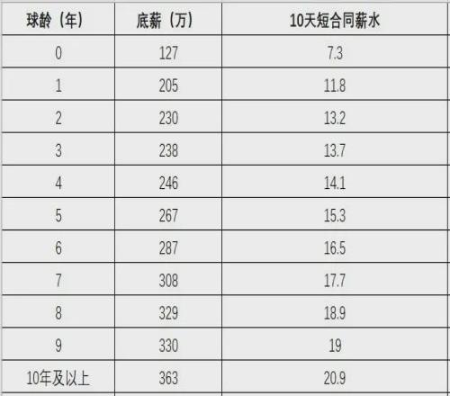NBA一个完整的赛季是174天,10天合同薪水用NBA底薪除以174,再乘以10就能算出来。由于NBA球员效力年限不同,底薪合同金额不一样,10天合同自然也不一样。以富尔茨为例,他在NBA打了8年,10天合同是18.9万美元。