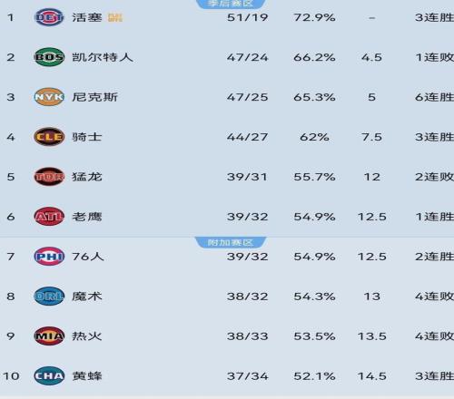 当前东部常规赛战绩排在猛龙前面的球队,分别是活塞(51-19)、凯尔特人(47-24)、尼克斯(47-25)和骑士(44-27)。