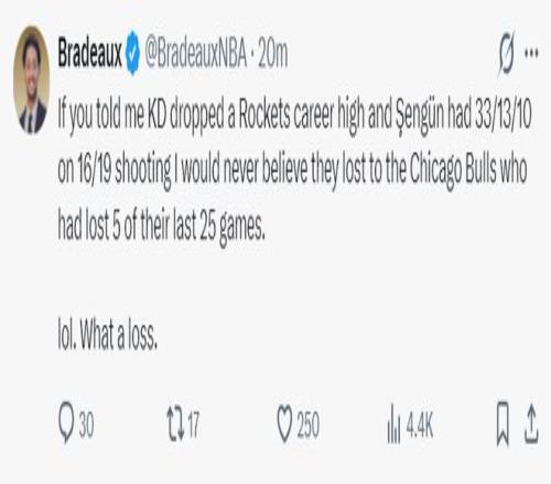 休媒谈到这场比赛的失利:杜兰特40分火箭生涯最高分,申京19中16拿到33+13+10,我真的不敢相信输给公牛这种球队 ,他们过去25场只赢了5场吧。