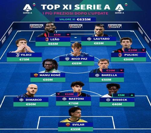 北京时间3月25日,在更新了意甲球员的身价之后,德转列出了此次更新之后意甲身价最高的11人阵容,劳塔罗领衔,国际米兰5人入选。