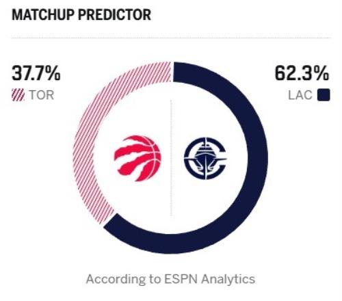 今日ESPN给出本场胜率预测,快船为62.3%,猛龙只有37.7%。