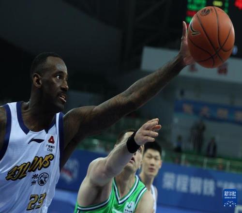 3月24日,浙江浙商证券队球员贾卡尔·桑普森(左)与天津先行者队球员大卫·詹姆斯在比赛中拼抢。新华社记者 孙凡越 摄