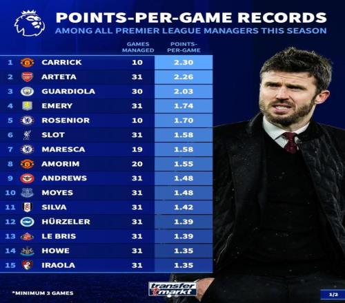 北京时间3月25日,德转统计出了本赛季在英超至少执教3场比赛的26位主帅场均积分,曼联新帅卡里克执教10场场均2.3分高居第一,阿尔特塔2.26分第二,瓜迪奥拉2.03分第三,图多尔和波斯特科格鲁场均0.2分垫底。